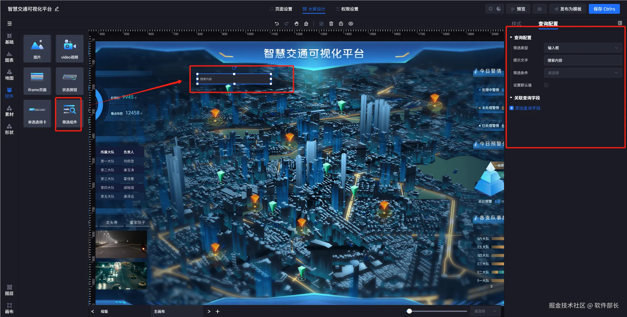 2、大屏新增筛选组件,可通过设置查询配置条件从而绑定对应查询字段。做到筛选目的。