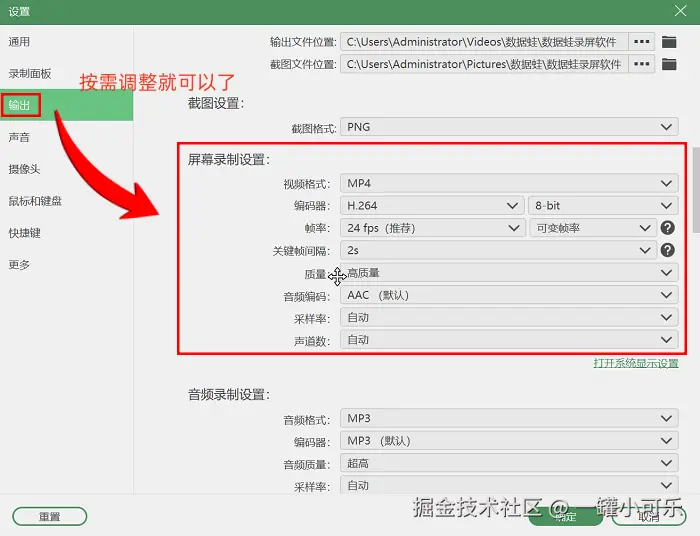 步骤2:选好录制模式后,还可以自由框选录制的电脑屏幕区域,选择开启麦克风或者扬声器。如果你想调整视频的格式、帧率等,就打开 “输出设置” 。全部都设置好后,点击 “开始录制” 按钮就可以开始录屏了。