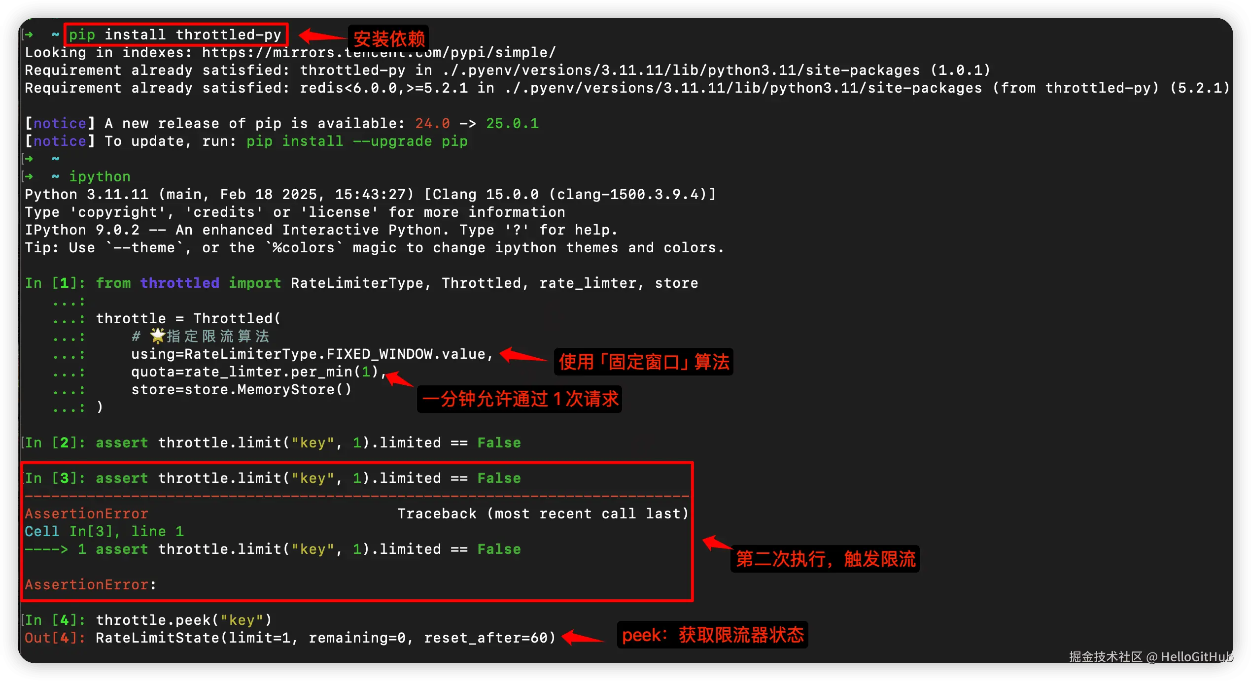 25、throttled-py:开箱即用的 Python 限流库。这是一款轻量且灵活的 Python 限流库,同步/异步皆可用。它支持多种限流算法,包括固定窗口、滑动窗口、令牌桶、漏桶和 GCRA,适配 Redis 存储后端,并提供函数、装饰器和上下文管理器等多种灵活用法。