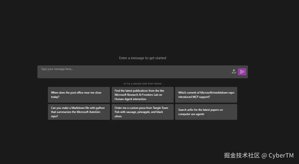 输入任务描述,例如:"搜集magentic-ui相关信息,并以公众号风格编写一篇介绍magentic-ui的markdown文章"