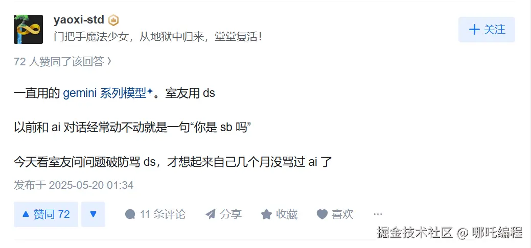 顺便提一下,我已经从ds切刀Gemini了,体感上能击败Gemini的只有Claude Opus 4了,Opus 4是唯一一个懂得提炼和抓重点的ai,最少的代码完成最核心的功能。但是Opus 4太贵了,次数太少了,问了两次,花了我10刀,肉疼。