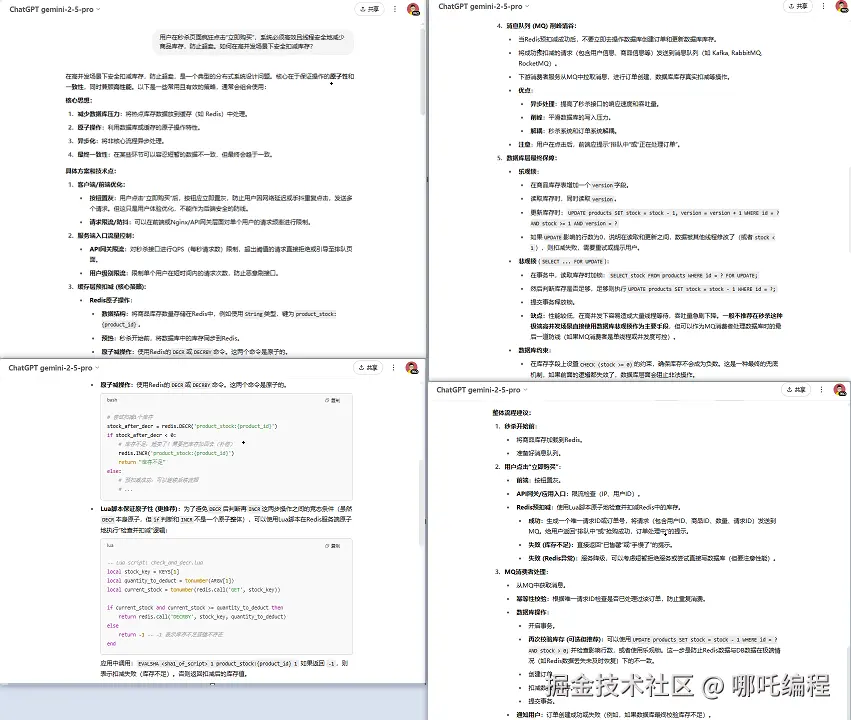Gemini 2.5 pro给出了核心思想、具体方案和技术点、具体的Lua脚本、通过消息队列 (MQ) 削峰填谷的解决方案、整体流程建议,真的是面面俱到,开发中可以直接使用。