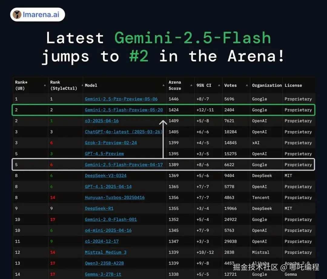 发布最新编程模型Gemini 2.5 Flash Preview 0520,会思考的flash、速度更快、更经济,性能已经无限接近Gemini 2.5 pro。