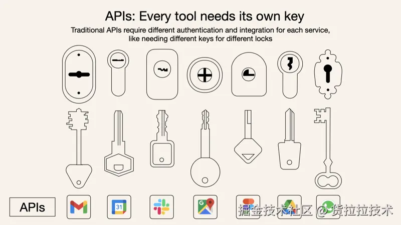 MCP模式:我们直接看下面的图,MCP协议提供大模型和工具的适配接口,互相只用聚焦本身能力上限