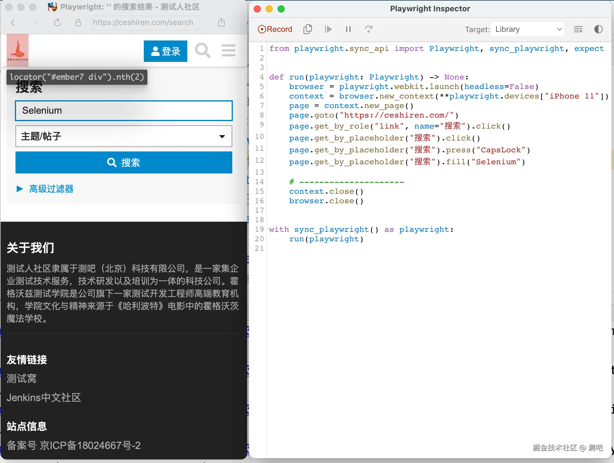 以下为测试人论坛搜索功能的测试步骤,请使用 Playwright 自动化测试代码实现: