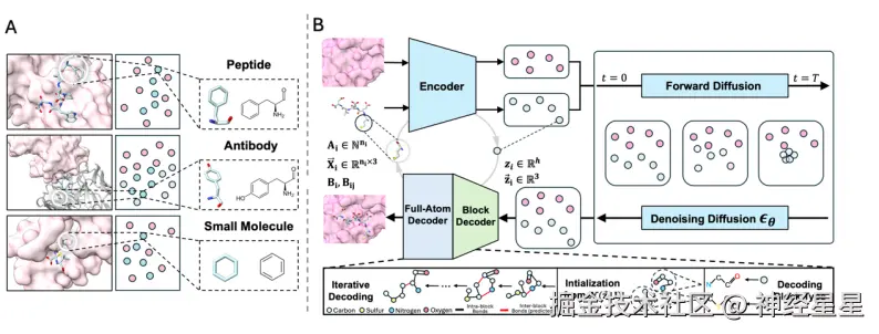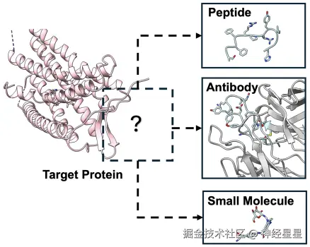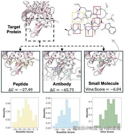 因此,面对不同的疾病机制、靶点特征和用药需求,适合使用的分子类型是不同的。现有的生成方法通常只针对某一类分子(如小分子、肽或抗体)进行建模,既无法满足多样化的治疗需求,也无法利用不同分子之间的共性来提升模型性能。