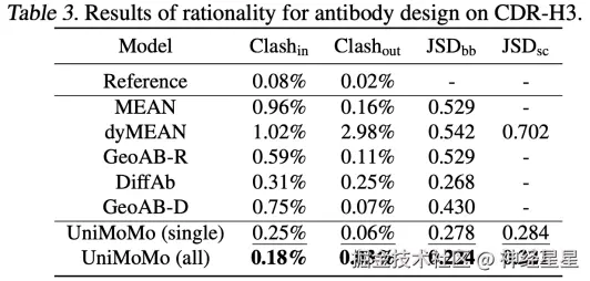 同样的,使用跨分子类型数据联合训练的 UniMoMo(all)在所有指标上均优于仅使用抗体数据训练的版本,说明统一建模确实有助于模型学习到更普适、更可迁移的分子结构空间规律。 这一结果凸显了不同分子类型之间在结构建模上的共性,也验证了跨域数据融合对提升生成质量的显著价值。