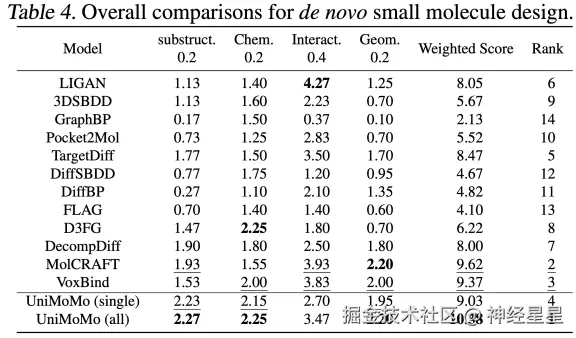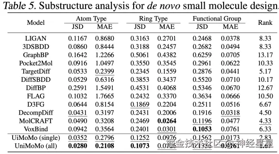结果显示,统一训练的 UniMoMo 在所有分子类型上都实现了全面超越, 不仅在结构还原精度上表现优异,更在关键的几何合理性和与靶点的相互作用质量上取得显著提升。