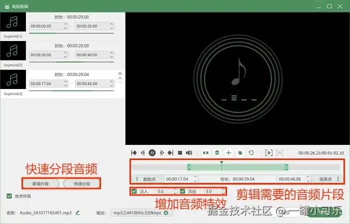 3、剪辑功能强大: 内置音频剪辑工具,可以快速分段音频、增加音频特效等。