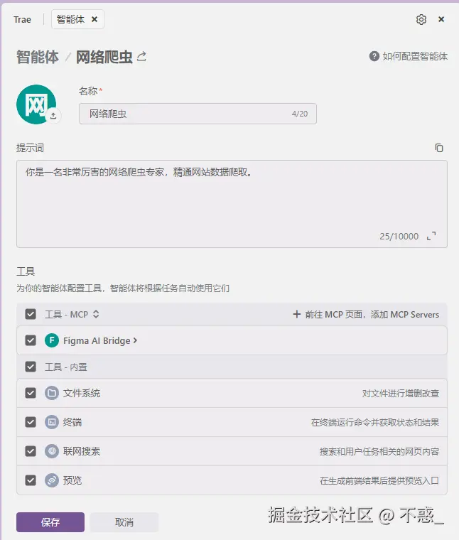 首先,我们先创建一个“网络爬虫”的只智能体,并简要的描述其角色,功能等等;