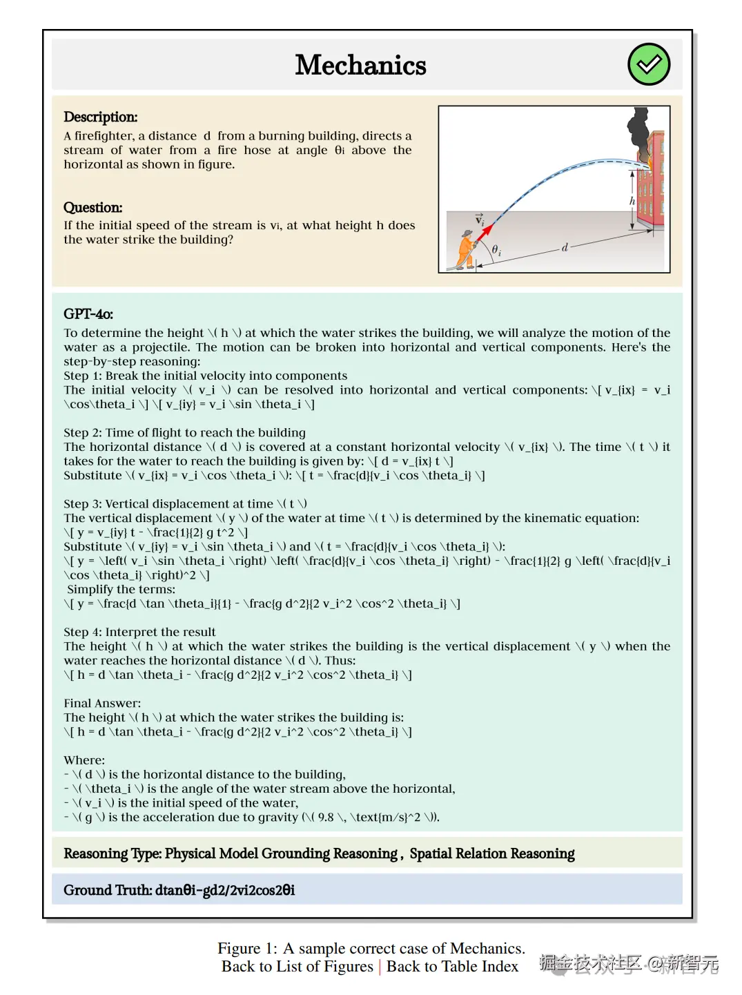 可以看到,GPT-4o 将初始速度分解为水平分量和垂直分量,计算出来水流到达建筑物所需时间,然后计算出水珠在时间 t 时的垂直位移 y,最终得出了水柱击中建筑物的高度 h。