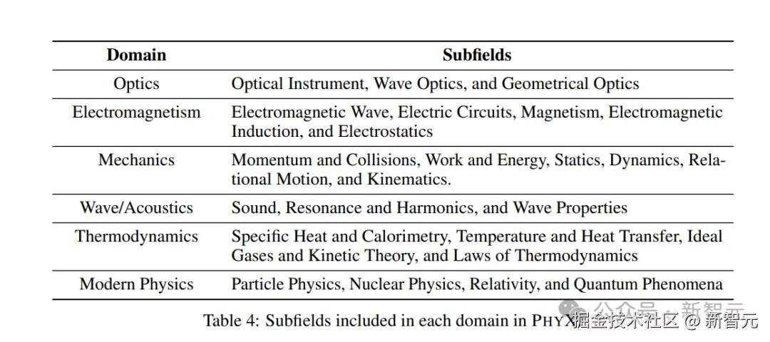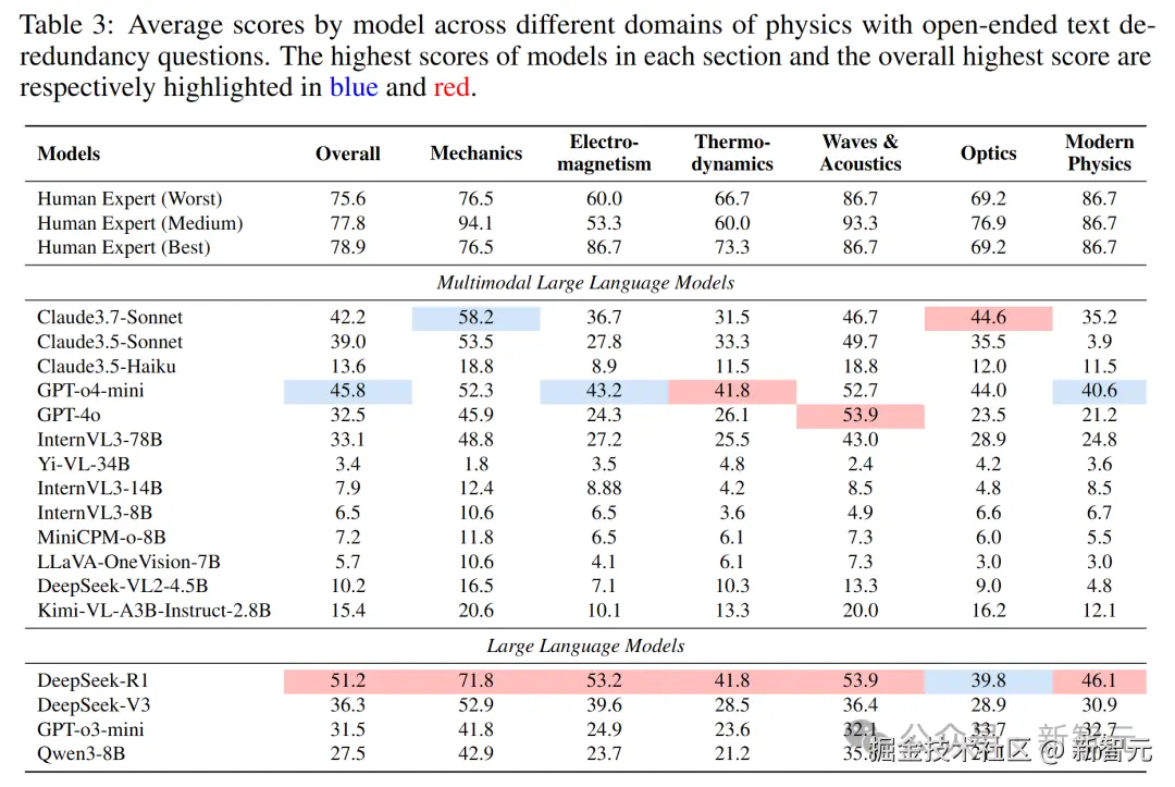 不同物理领域中,模型在开放式去冗余文本问题上的平均得分。各领域模型的最高得分用蓝色高亮显示,整体最高得分用红色高亮显示