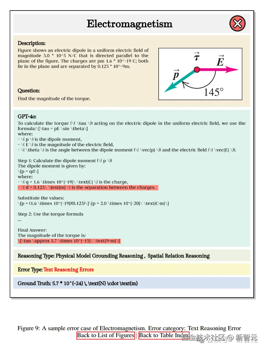 第二道题目中,GPT-4o 按部就班地分析了电偶极子的性质和电场角度,计算了力矩的大小,但由于对文本描述的误解,导致结果与标准答案不符,暴露了文本推理的弱点。