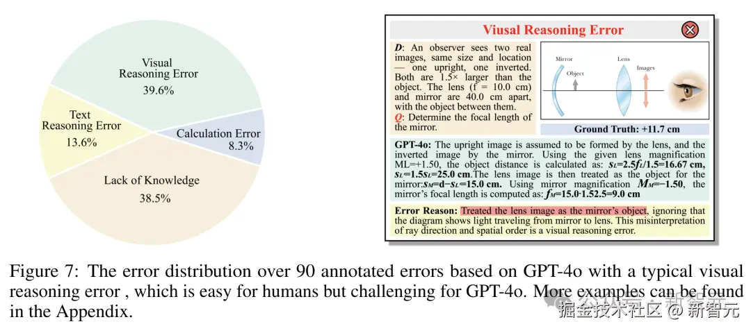 基于 GPT-4o 分析的 90 个标注错误的分布显示,其中一个典型的视觉推理错误对人类来说很简单,但对 GPT-4o 却颇具挑战