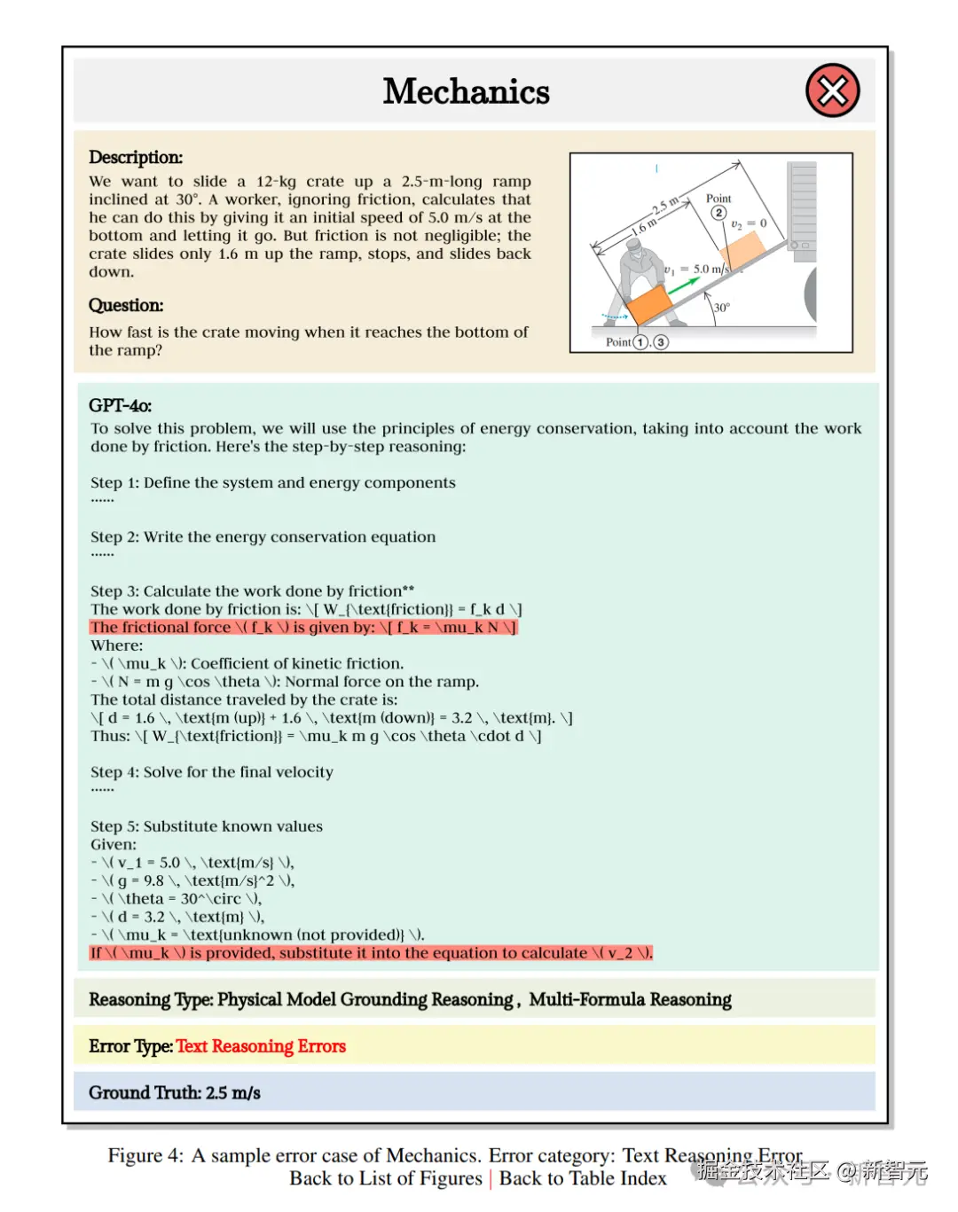 在解题过程中,GPT-4o 正确写出了能量守恒方程,然后计算摩擦力做的功这一步时除了错,导致接下来的最终速度也解错了。