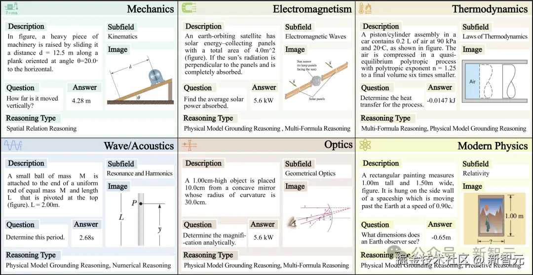 经过专家验证的数据设计,涵盖六个核心物理领域:热力学、电磁学、力学、现代物理学、光学以及波动与声学;并包含六种不同的物理推理类型:物理模型推理、空间关系推理、多公式推理、隐含条件推理、数值推理和预测推理;