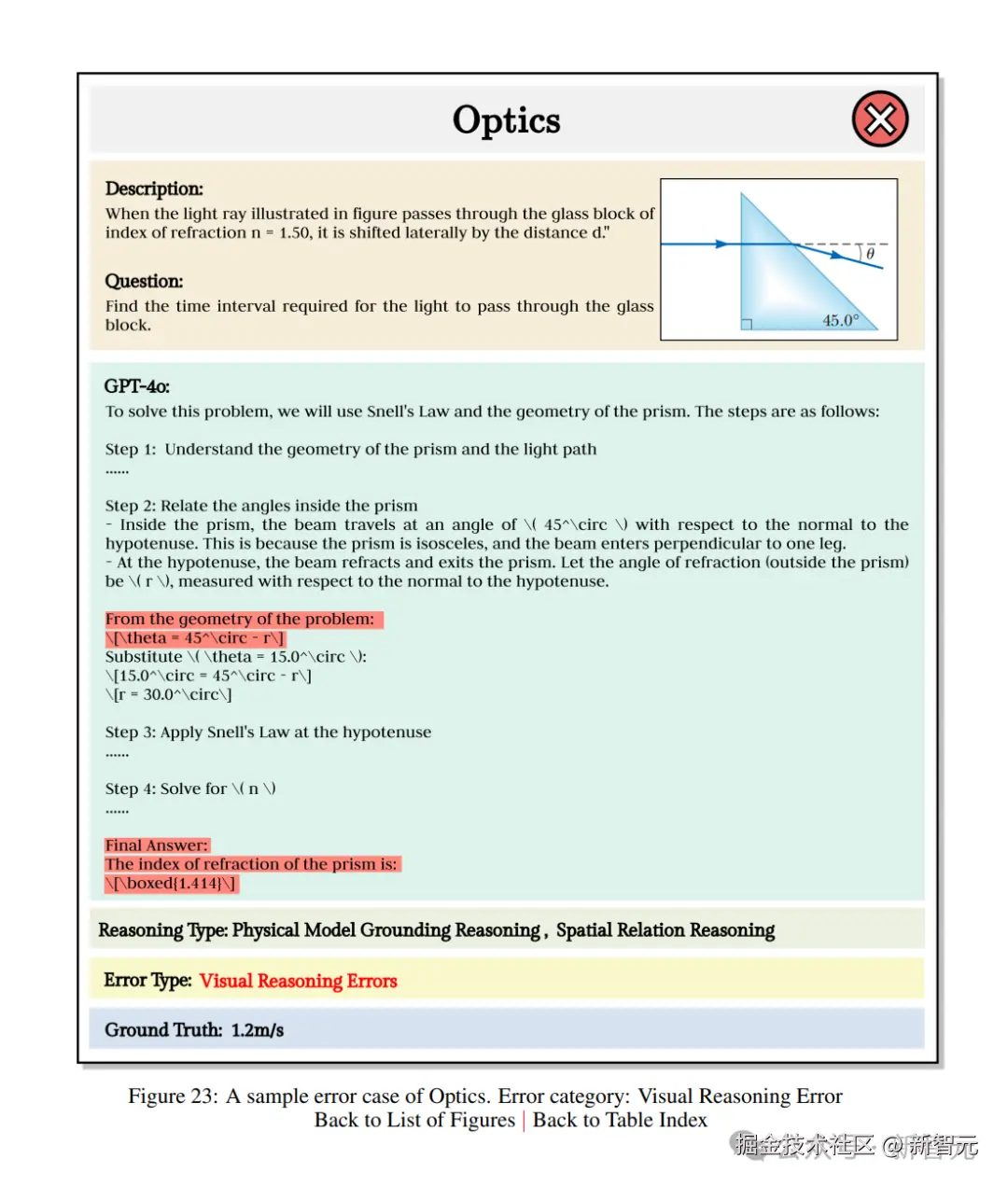 这道题运用了斯涅尔定律和棱镜几何知识。GPT-4o 虽然正确理解了棱镜内外折射角的关系,却在第二步计算θ角时出错了。