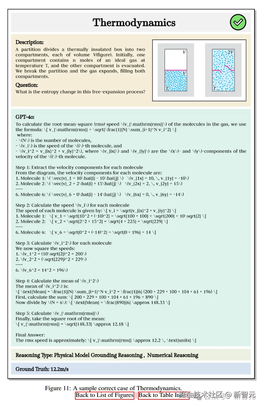 GPT-4o 先从图中提取了每个分子的速度信息,逐步计算了每个分子的速度大小,然后求出所有分子的平均速度,最后通过比较初始和最终状态,准确得出气体分子平均速度的变化,答案完全正确。