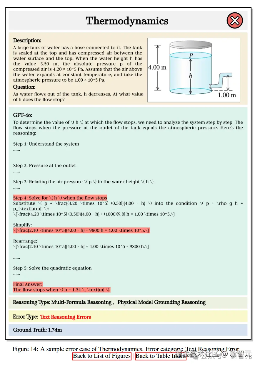 GPT-4o 的分析过程有误。它分析了水箱内的压力和水的高度关系,试图通过平衡条件推导出水流停止时的水面高度,但由于对文本描述的理解出现偏差,计算结果偏离了标准答案。