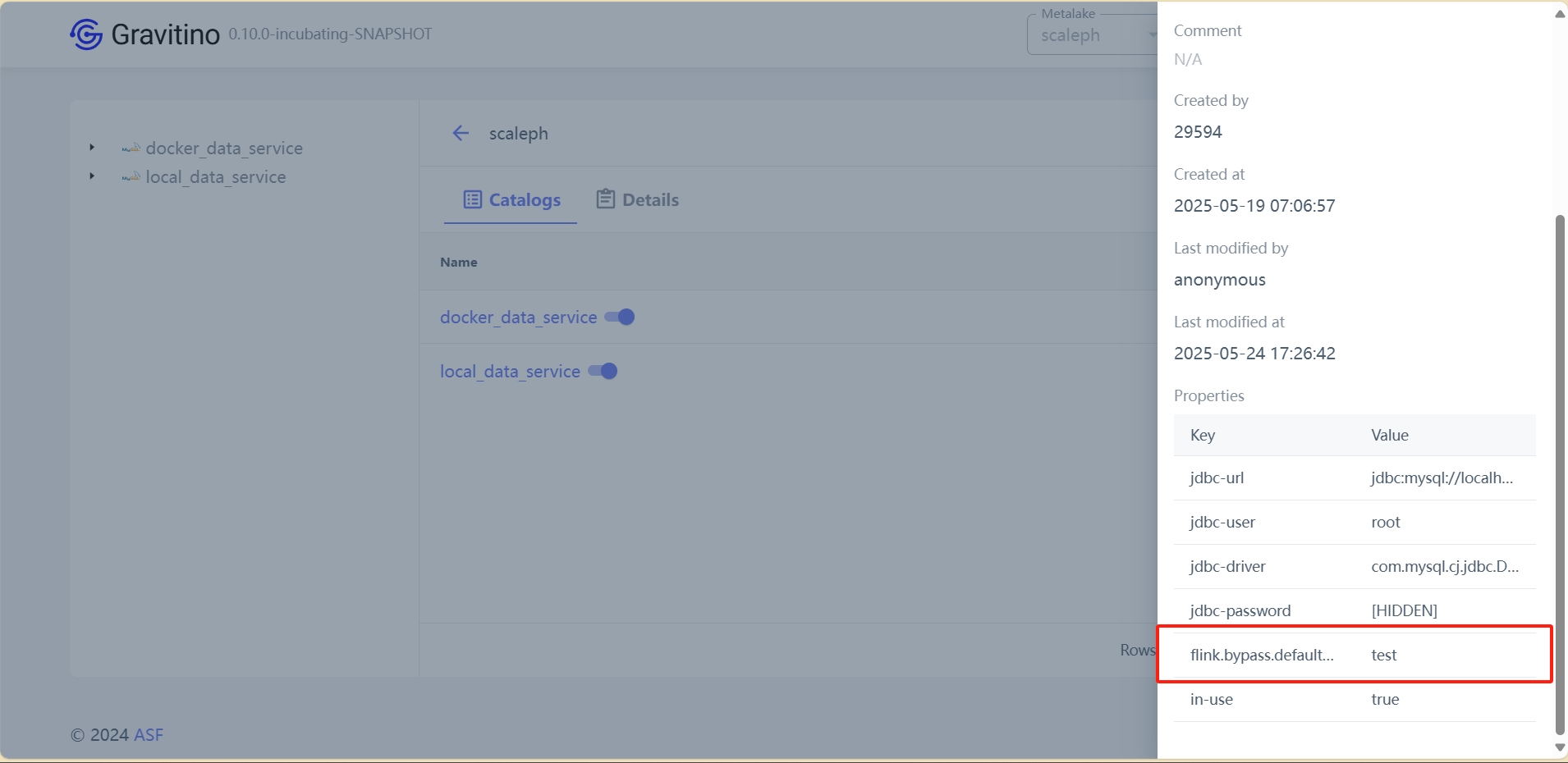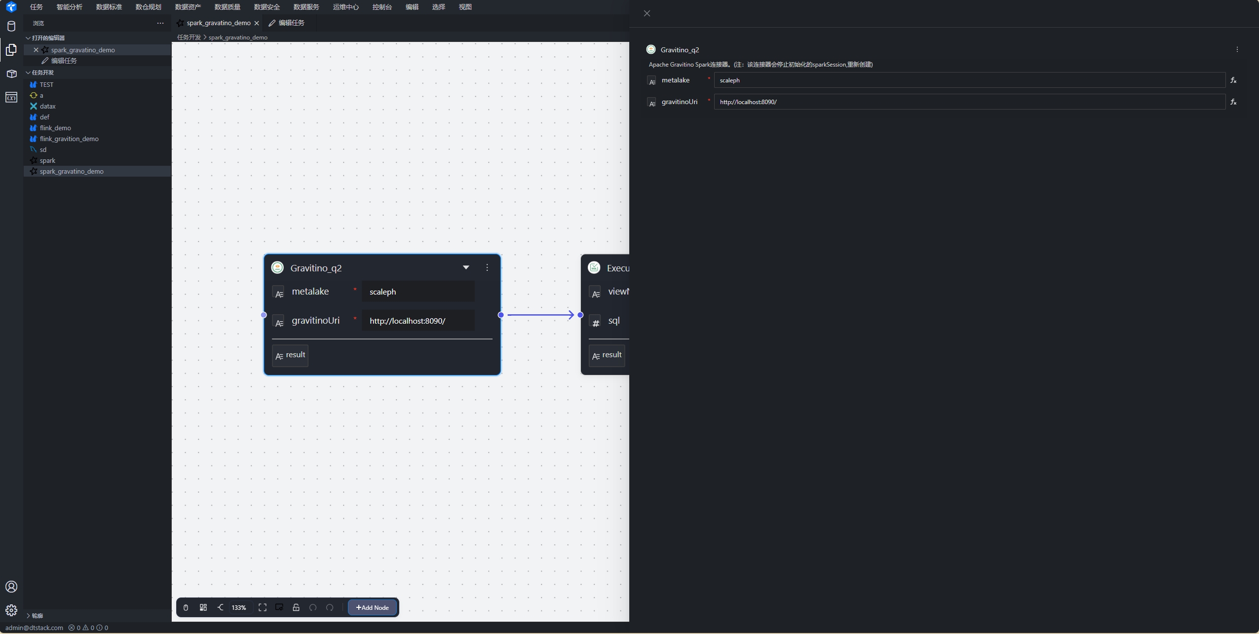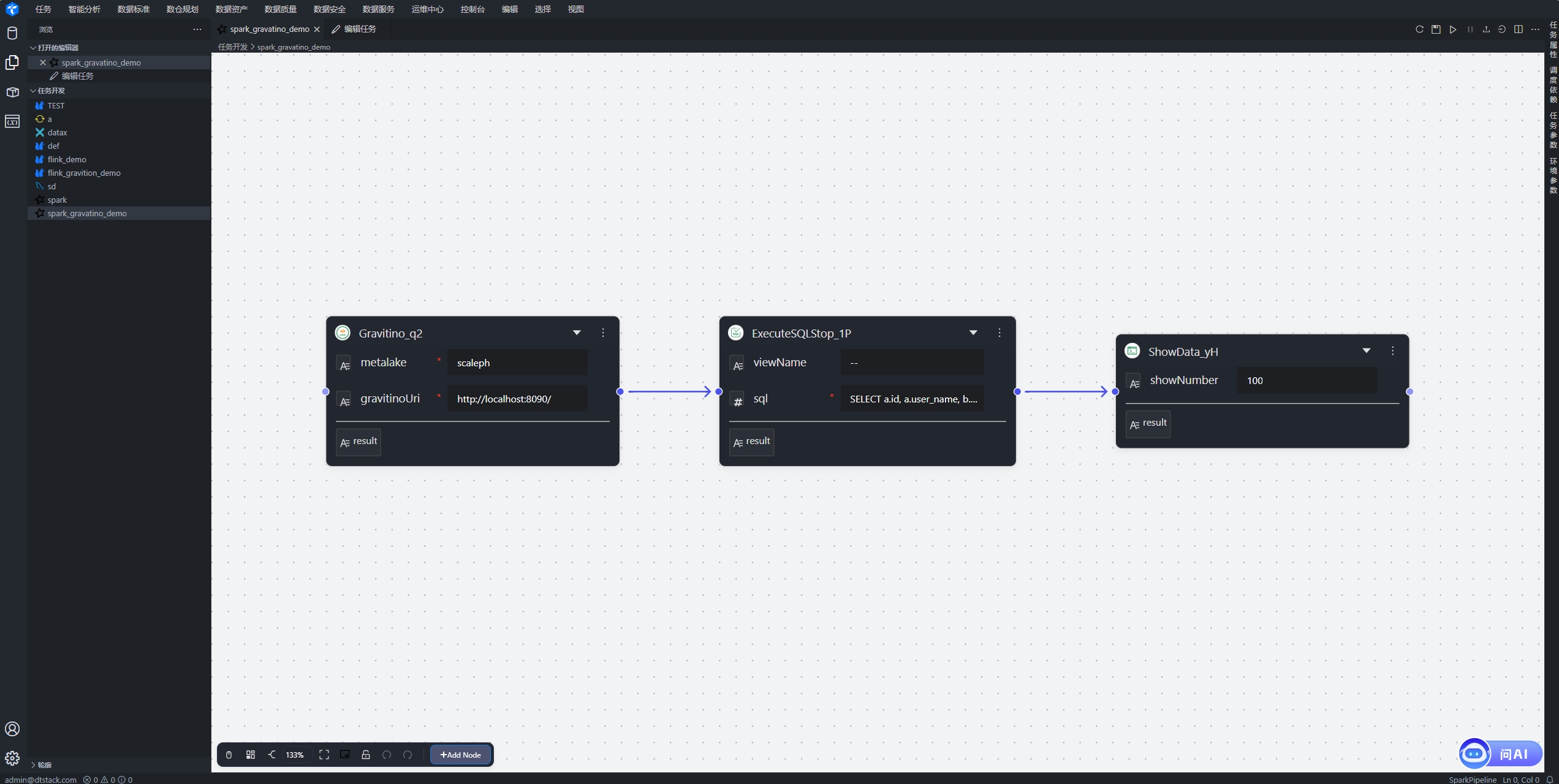 • SQLQuery节点:执行sql查询语句。跨catalog实现联邦查询``` SELECT a.id, a.user_name, b.description FROM local_data_service.dolphinscheduler.t_ds_user a left join docker_data_service.dolphinscheduler.t_ds_tenant b on a.tenant_id = b.id