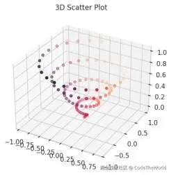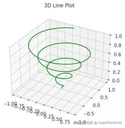我们使用np.linspace()在0到1之间生成100个点作为z,然后计算x = z * np.sin(25z)和y = z * np.cos(25z)以形成一个螺旋线。使用ax.plot3D(x, y, z, 'green')绘制三维螺旋线。