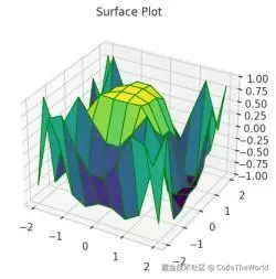 我们使用np.outer()创建一个包含x和y的网格,然后计算z = np.cos(x2 + y3)。使用ax.plot_surface()可视化该曲面,其中cmap='viridis'用于设置颜色,edgecolor='green'用于设置网格线颜色。