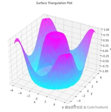 在定义函数并使用np.meshgrid()生成x和y之后,我们使用.ravel()将它们展平,并创建一个Triangulation对象。使用颜色映射和透明度通过ax.plot_trisurf()绘制曲面。