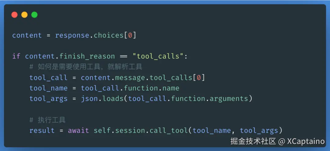 大模型通过Query和提供的工具进行推理,确定完成用户任务需要执行的工具,如果LLM返回结果中如果需要执行tool_calls,则在会话中调用MCP Server。