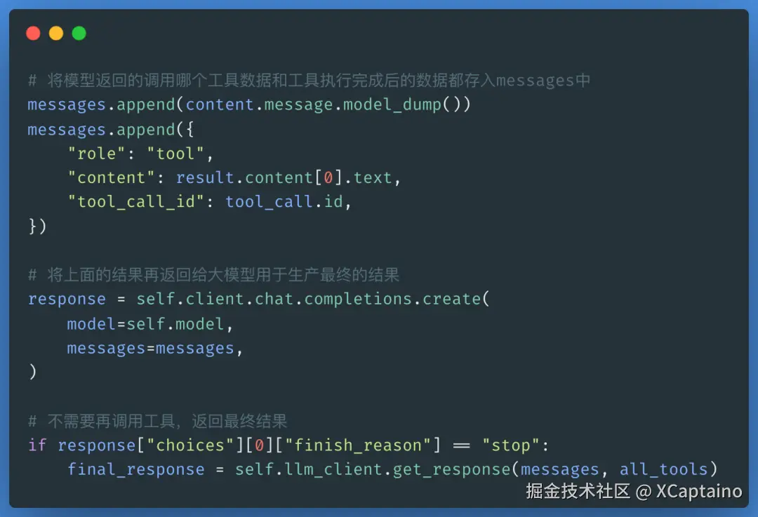 Host将MCP Server执行的结果和Message一并发给LLM,如果不需要再调用其他工具,那么调用LLM做最后润色后返回最终结果。