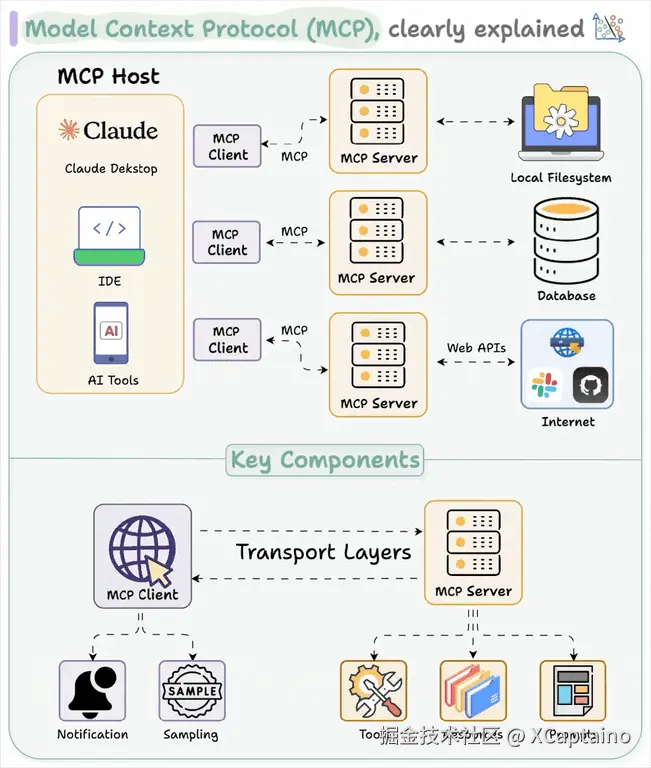 如上图所示,在MCP架构体系中,包含MCP Server、MCP Client和MCP Host几个核心组件,及组件间交互协议。