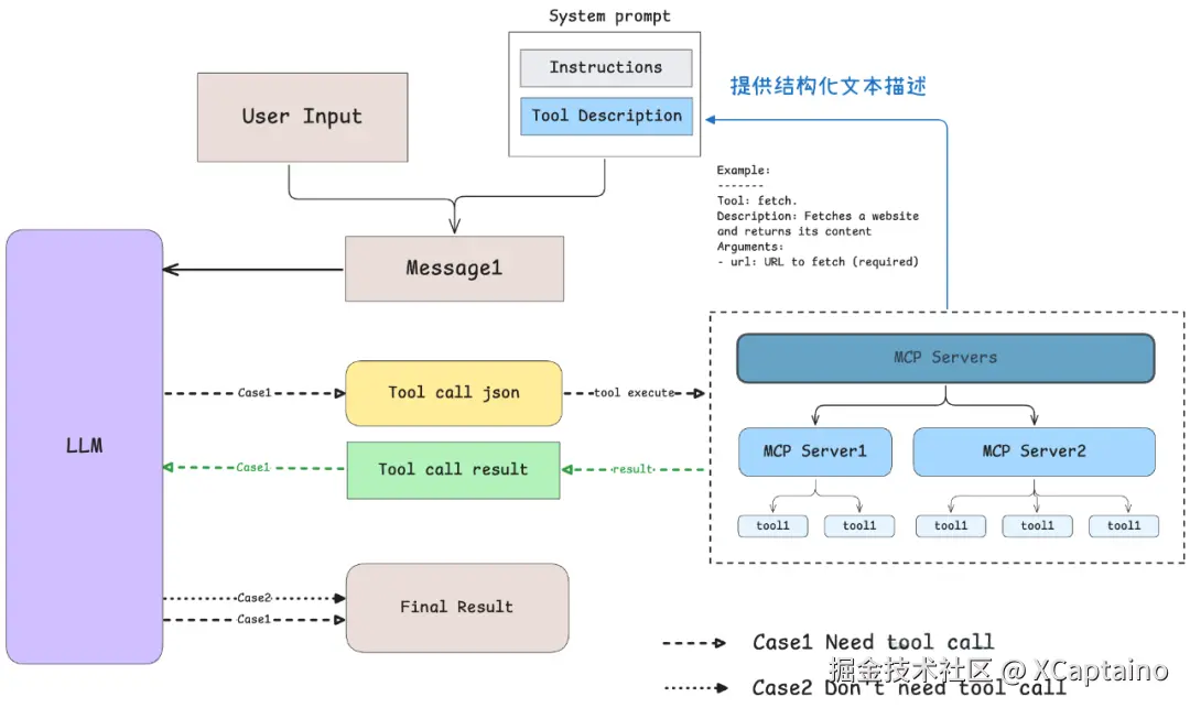 - MCP Client首先从MCP Server获取可用的工具列表;
