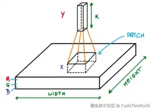 现在想象一下,取这张图像的一小块区域,在上面运行一个小型神经网络,这个网络也称为滤波器或内核,比如说它有K个输出,并将这些输出纵向排列。现在,将这个神经网络在整个图像上滑动,结果是,我们会得到另一张具有不同宽度、高度和深度的图像。现在,我们不再只有R、G和B通道,而是有更多的通道,但宽度和高度会变小。这种操作称为卷积。如果小块区域的大小与图像的大小相同,那它将是一个常规的神经网络。