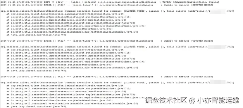 - 应用日志检查:发现应用连接Redis时抛出cluster nodes获取异常。