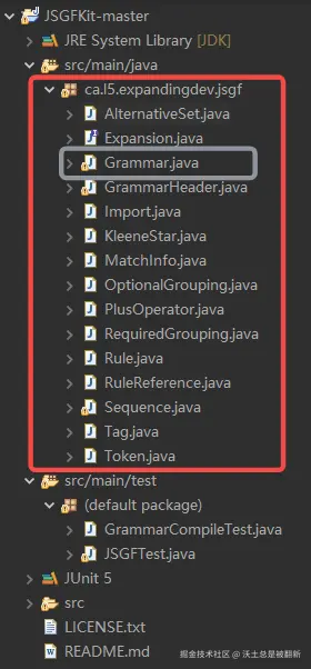 上图是JSGFKit项目在Eclipse中的结构截图,其中主要的代码在图中红色框框内的ca.l5.expandingdev.jsgf中,最核心的代码在银灰色框内的Garmmar.java中,其他诸如AlternativeSet.java等都是JSGF通用语法的定义文件,实现大致同之前的pyjsgf。