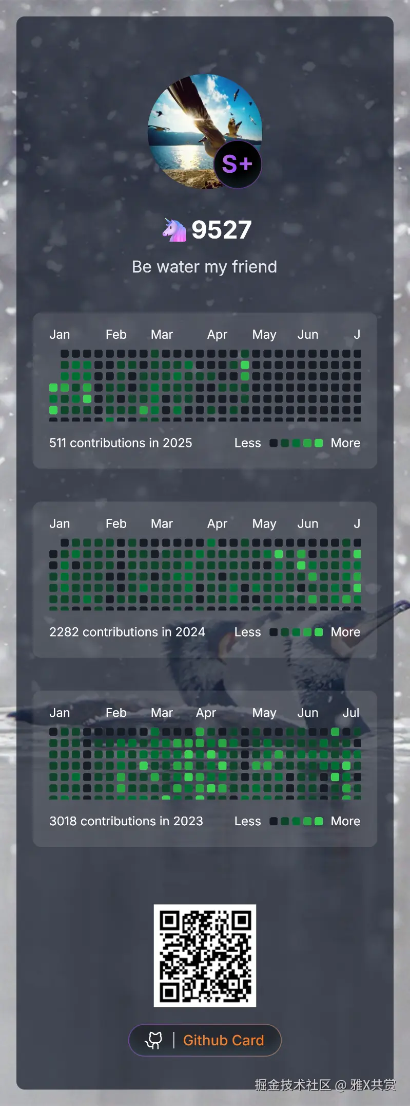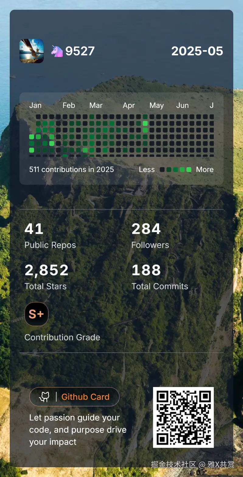 - 个人资料卡片生成:自动创建包含贡献统计、技能标签等信息的精美卡片