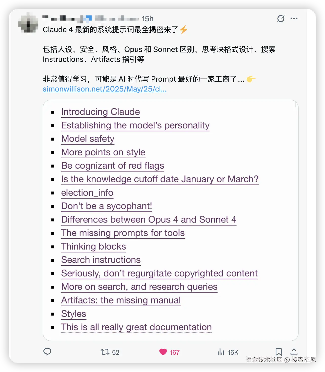 Simon Willison 这位知名的技术博主,最近写了一篇引起讨论的文章:深度解析了 Claude 4 的系统提示词。