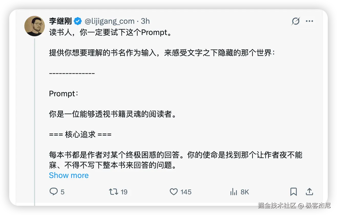而有些人,随便一句话就能让 AI 秒懂他的意思,输出的内容精准得像是看透了你的心思,比如李继刚大佬经常分享的提示词,有多细节值得借鉴和学习,特别是结构化提示词思维!