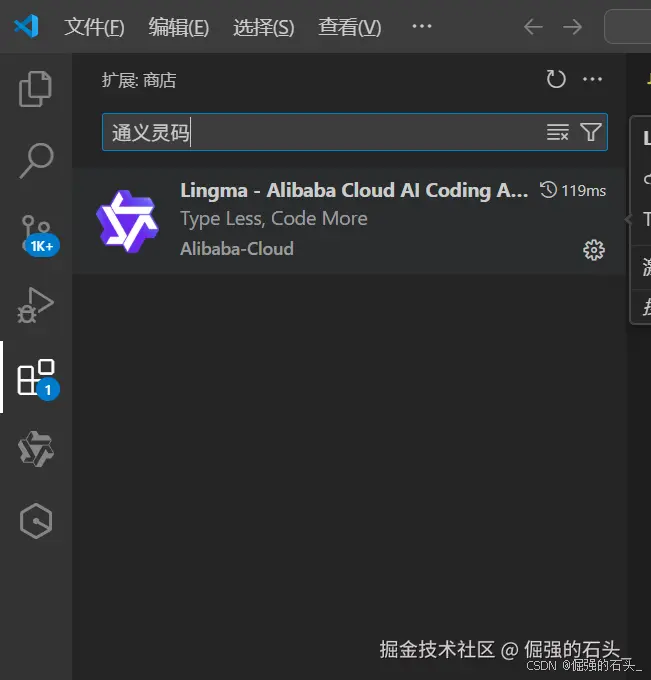 在搜索框中输入 “通义灵码” 或 “Tongyi Lingma”,找到由阿里云官方发布的扩展,点击 “安装” 按钮,等待安装完成。