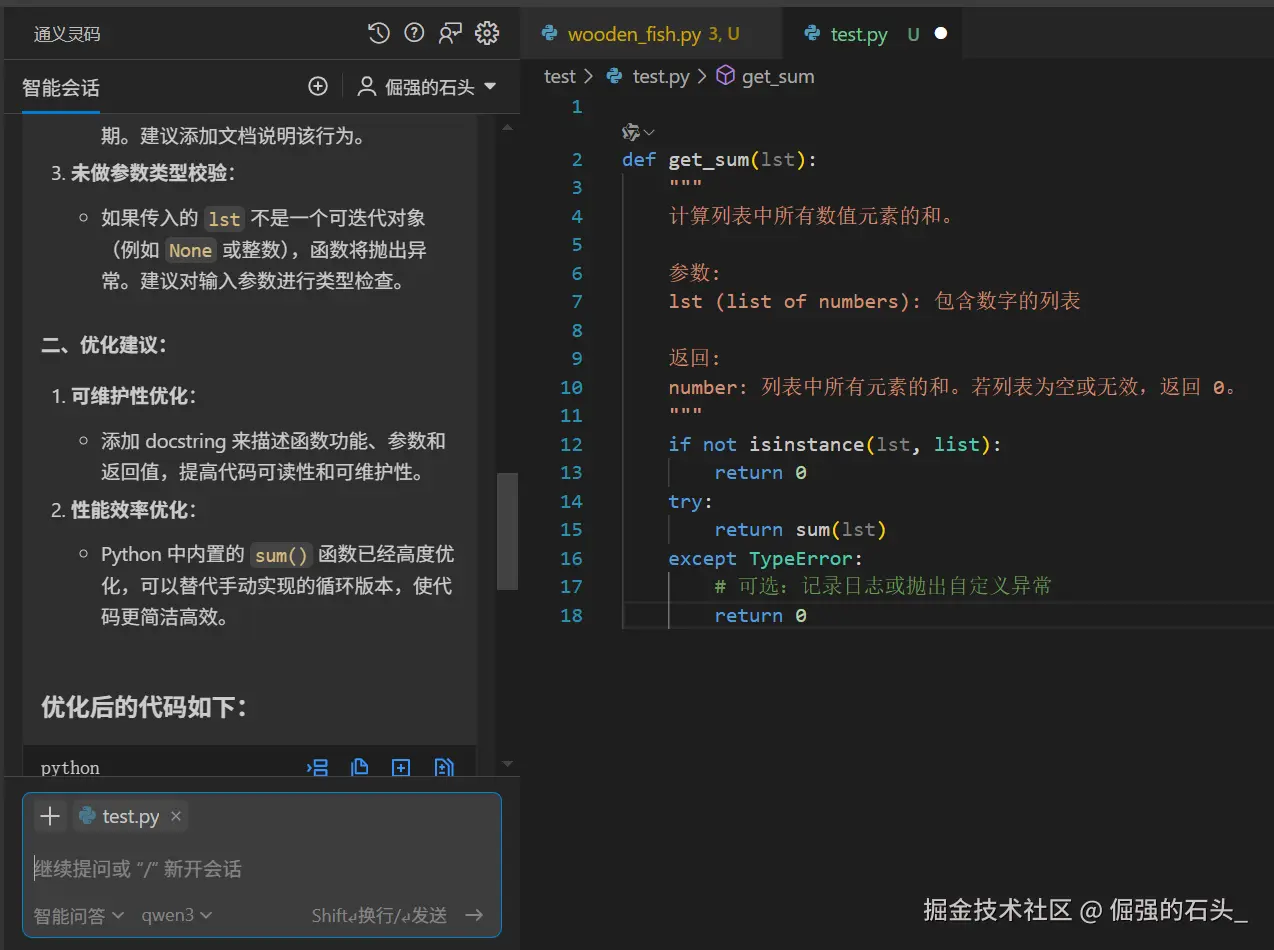 通义灵码还具备一定的代码优化能力。当你编写的代码存在明显的性能问题或不规范之处时,它能给出优化建议。