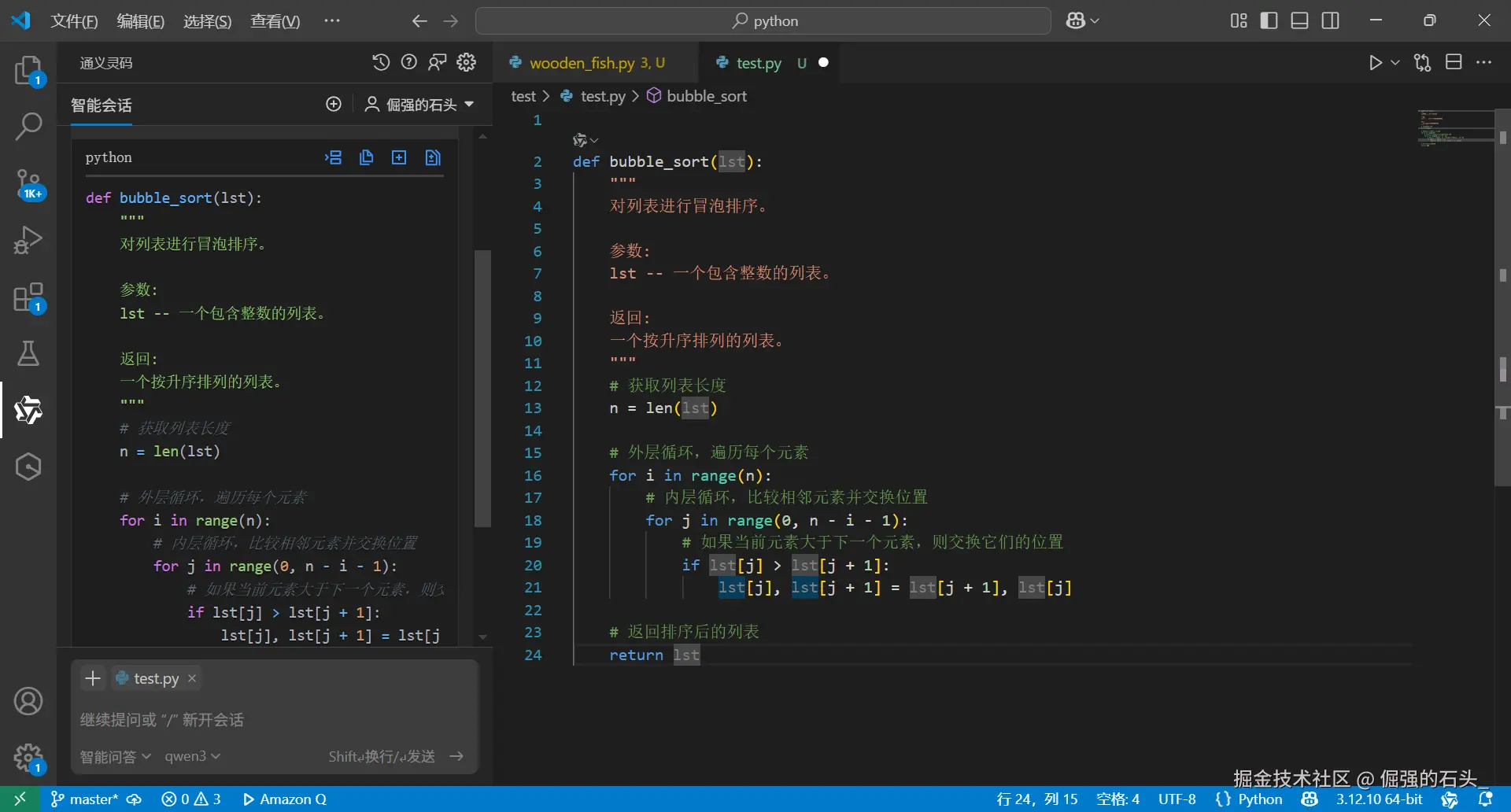 在团队协作开发或维护复杂代码时,清晰的注释至关重要。通义灵码可以帮助你快速生成规范的代码注释。选中一段代码,例如下面这段实现冒泡排序的 Python 代码: