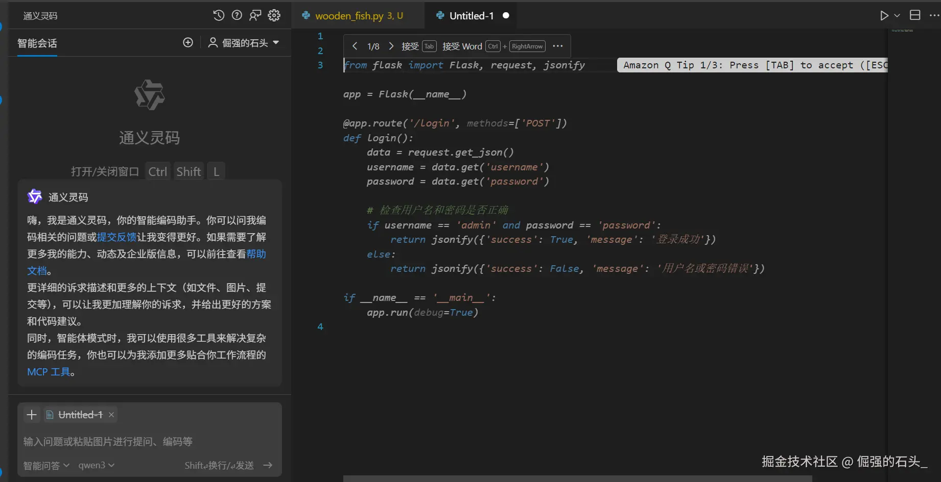 假设你要开发一个简单的 Web 应用,需要创建一个用户登录接口。此时,只需在代码注释中写下 “创建一个 Python Flask 框架的用户登录接口”,通义灵码就能迅速分析语义,生成如下代码: