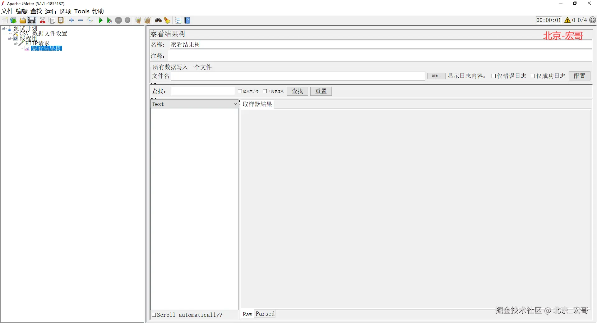 1.保存测试脚本为test.jmx,然后运行,查看结果。如下图所示: