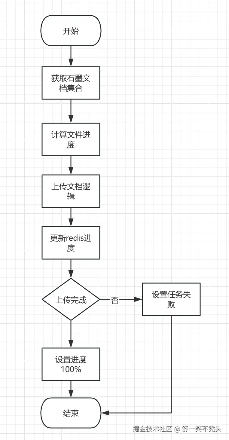 石墨文档支持从链接🔗方式获取文件信息,通过对文件链接的截取,会得到16位编码的值。同时不仅仅针对单文档,也支持指定文件夹或者空间下的方式,只需要对对应的文档或者文件夹📁或者空间添加对应的协作者(石墨文档API下载需要私有化部署之后才可以提供,官方不带开放平台)。就可以通过对应的下载文档接口进行对应的逻辑下载,关于如何下载的大致流程如下图所示。本次只介绍进度条逻辑如何实现,关于如何上传本次文章不做展开。