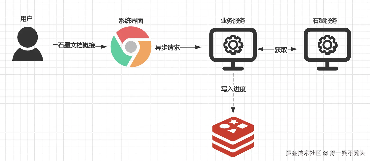 用户层面结合技术层面大致的交互流程是,用户首先从石墨文档获取需要上传的文档链接,进行录入到对应的系统界面。调用后端服务的方式,由后端服务通过配置相关密钥与协作者(石墨管理员)获取相关文档信息。将获取到的相关文档之后,在业务服务中进行与redis交互,存储进入进度。