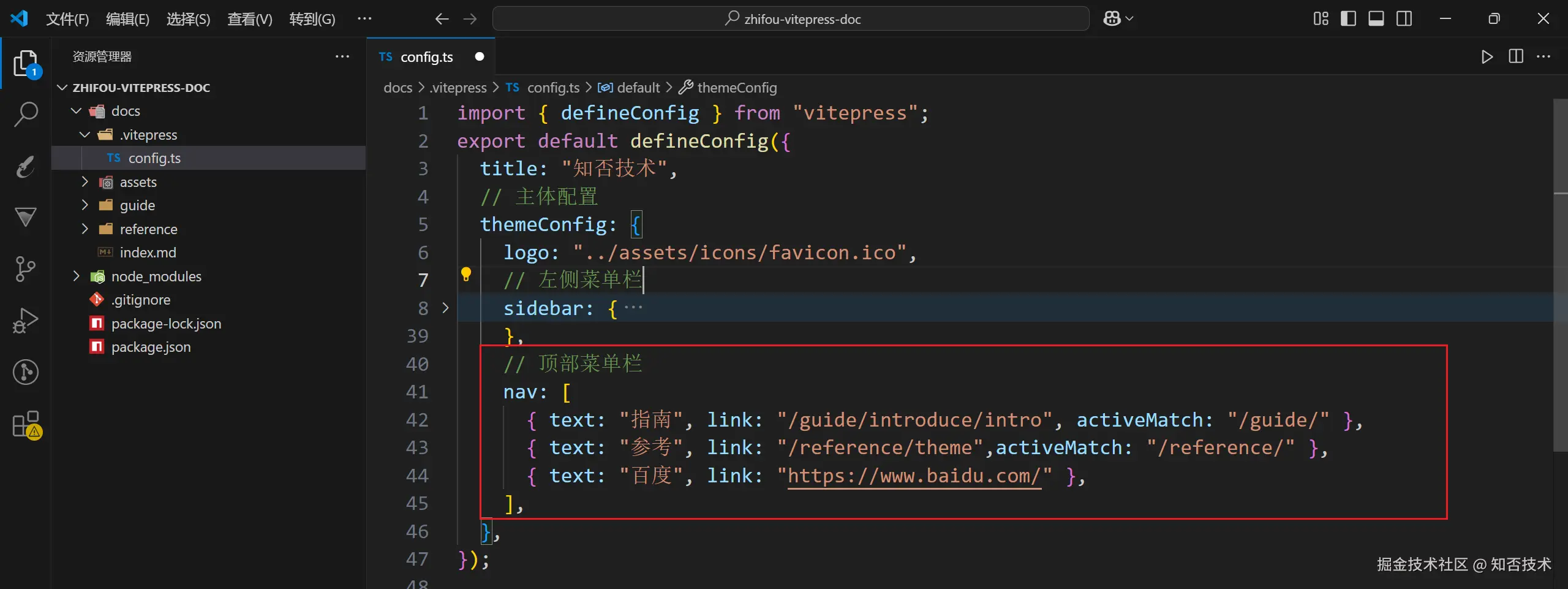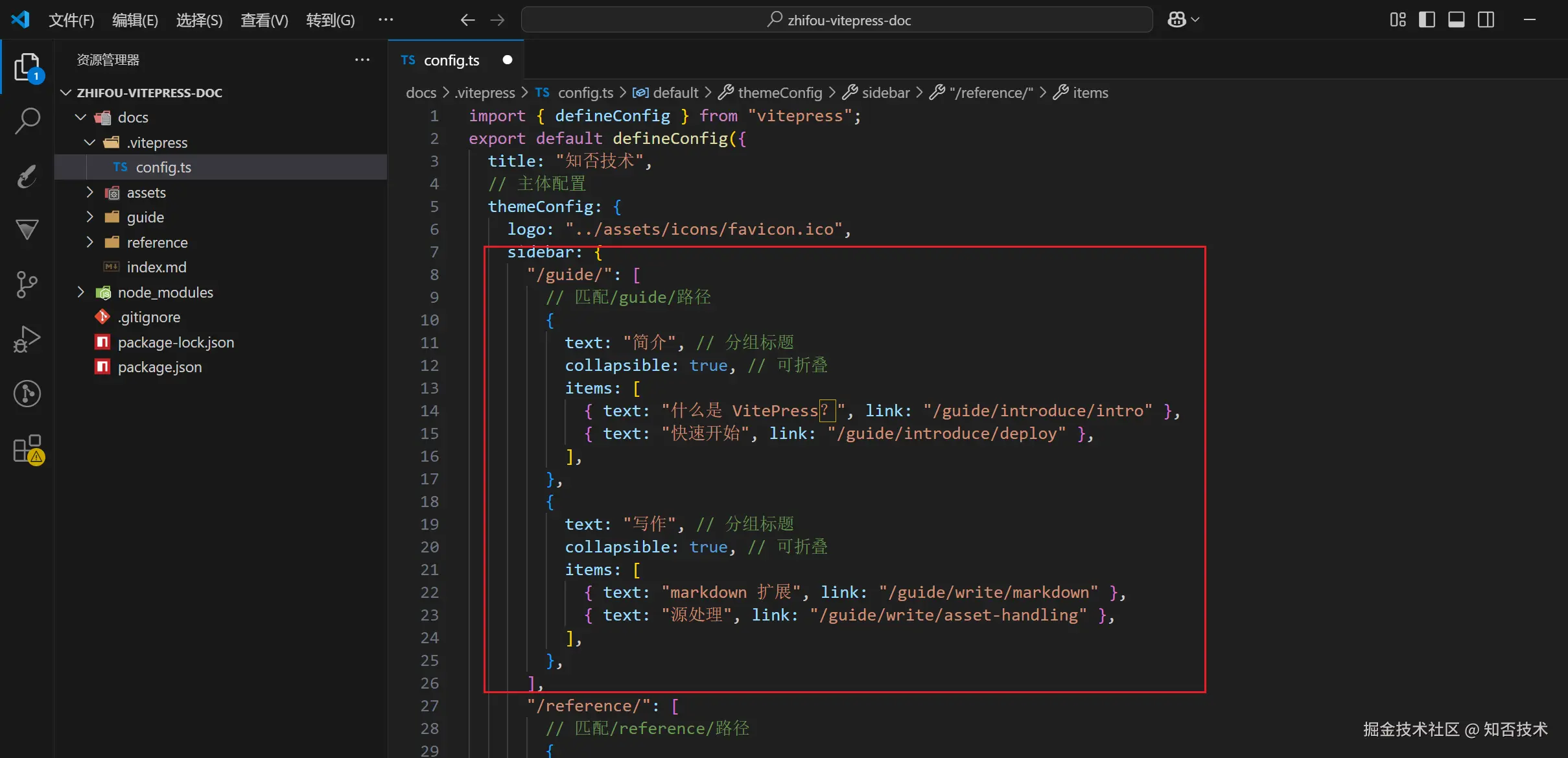 然后在 themeConfig 里面配置 sidebar 属性