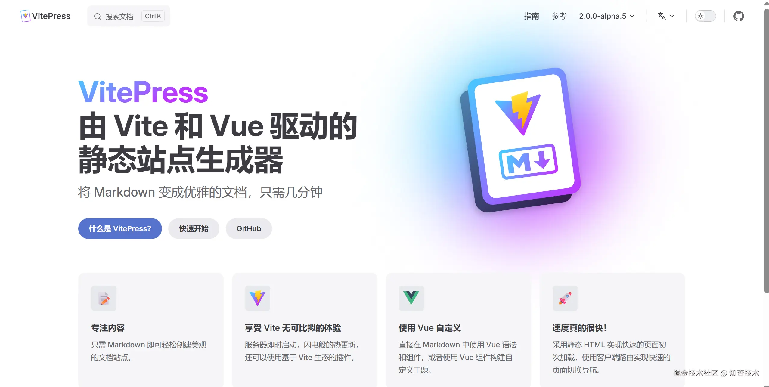 VitePress: 由 Vite 和 Vue 驱动的静态站点生成器。将 Markdown 变成优雅的文档,只需几分钟