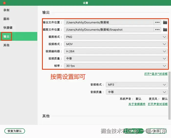 步骤2:选择录制区域、录制的音频源。如果有需求,还可以在 “输出设置” 中自定义视频的输出格式、帧率等。设置完毕后点击 “REC” 就可以开始录制了。