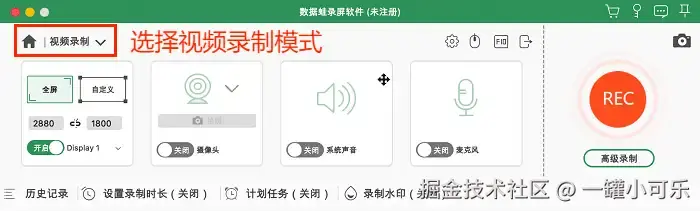 步骤1:打开数据 蛙录屏软件后,等待页面加载。加载好主页面后,在主页面选择合适的录制模式,本文选择 “视频录制” 模式。