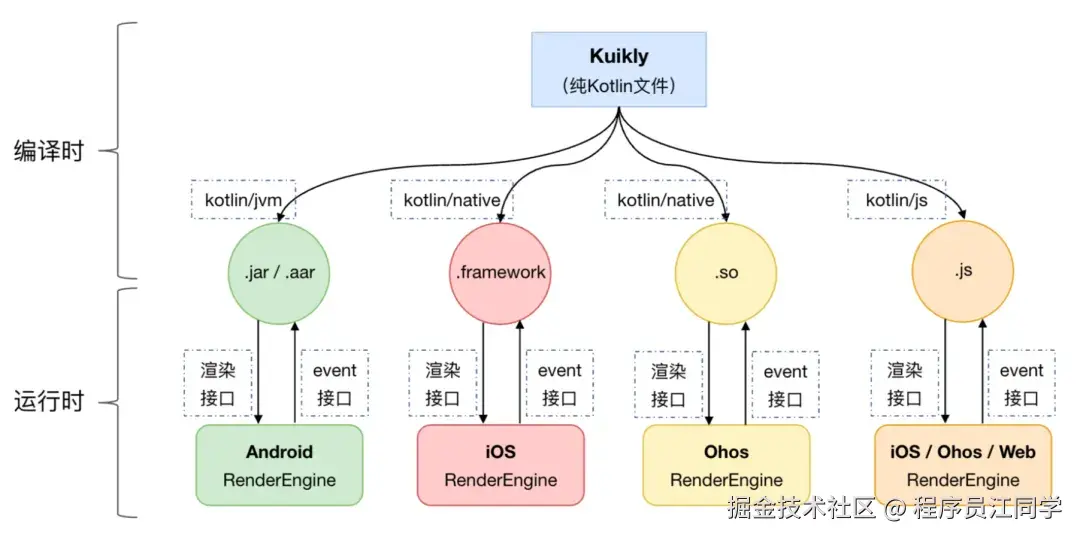 - 设计思想差异:KMP 核心是 “编译时” 哲学,将 Kotlin 代码直接编译成各平台原生格式,如 Android 的 JVM 字节码、iOS 的机器码等,通过 expect/actual 机制实现逻辑层共享,UI 层原生。而 Flutter 是 “渲染引擎” 策略,利用 Skia 引擎在画布上自绘 UI,Dart 代码在 Dart VM 运行,通过 Platform Channel 与原生交互,带来统一视觉体验但存在应用体积膨胀等问题。