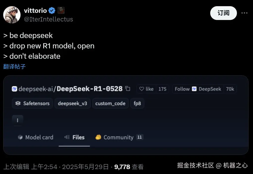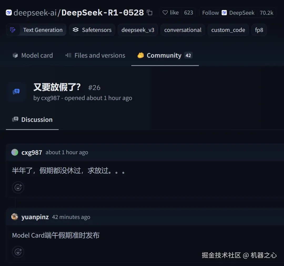 模型文件上传时间是凌晨 1 点,不知 DeepSeek 工程师们是不是加班到了最后一刻。也有网友表示,这回又在端午节假期前发新模型,简直比放假通知还靠谱。